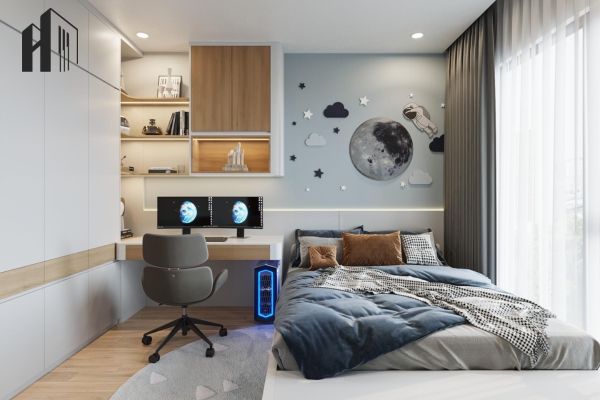 Thiết kế Bắc Âu cho gia đình nhỏ – Phòng ngủ phụ được tận dụng làm không gian làm việc.