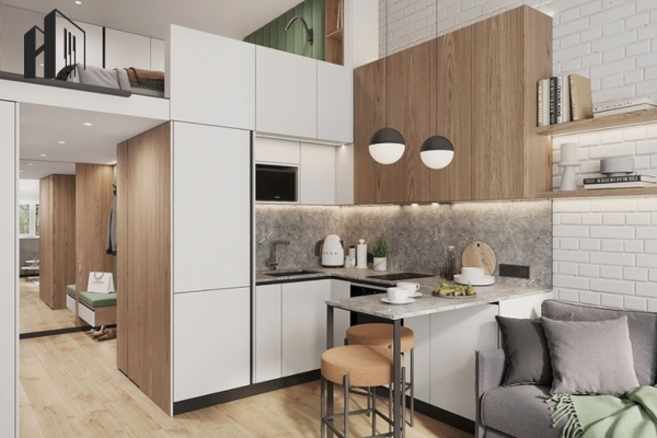 Bếp mở Bắc Âu liền mạch – Không gian bếp kết nối trực tiếp với phòng khách, tối ưu diện tích.