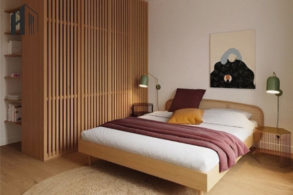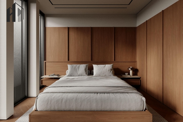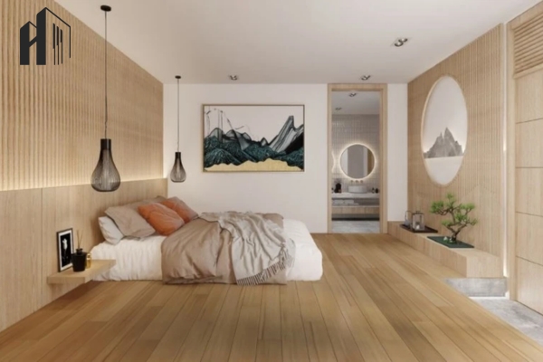 Thiết kế ấm áp kiểu Bắc Âu – Kết hợp tường ốp gỗ và ánh đèn vàng cho không gian gần gũi.