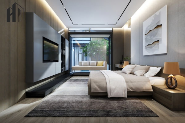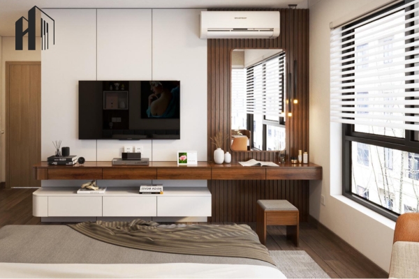 Thiết kế tích hợp Smart TV – Vách âm thanh vòm tích hợp giúp không gian giải trí đỉnh cao.