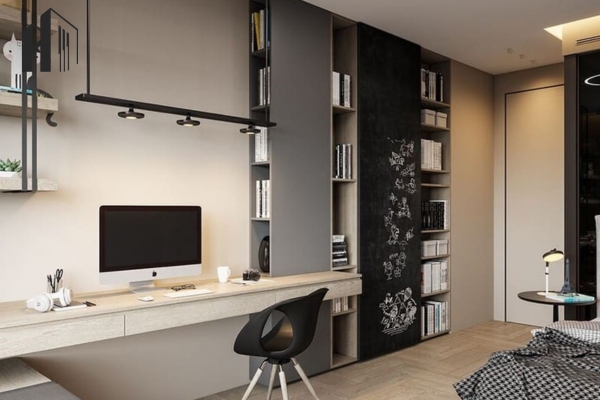 Không gian làm việc số – Bàn làm việc gắn tường, đèn LED cảm ứng, cổng sạc nhanh.