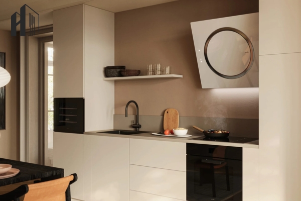 Bếp hiện đại tối ưu – Các thiết bị bếp cảm ứng, máy hút mùi ẩn, đảo bếp tích hợp.